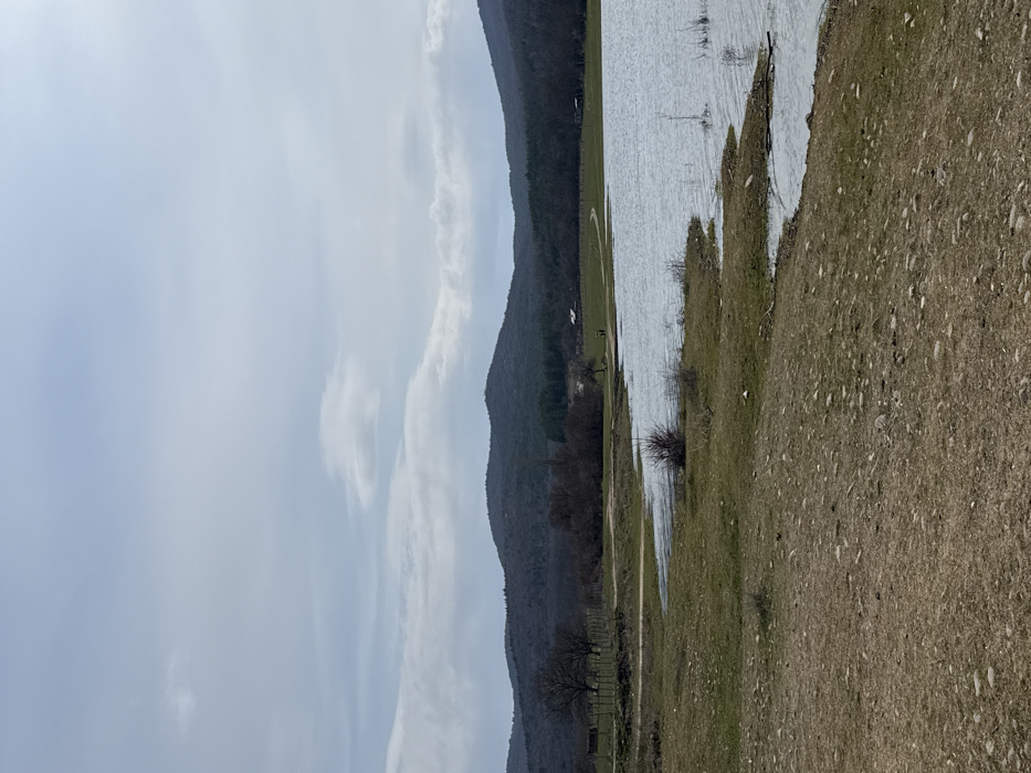 The image displays a rural landscape in the city of Panicherevo, Bulgaria, under an overcast, light gray-blue sky. In the foreground, a sloped area of dry, rocky ground with sparse patches of brown and green grass descends towards a calm body of water, likely a lake or reservoir. The immediate shoreline in the midground exhibits green grass and a few small, bare deciduous shrubs. Across the water, a dirt path or road is visible, curving to the right. Two small, dark human figures are present on this distant path, appearing to walk or stand. Beyond the path, sparse trees with minimal foliage are scattered, and two small, distant rural structures with dark roofs are identifiable; one appears to be a barn or shed on the left, and another smaller building is further right. The background features undulating hills and mountains, densely forested with dark green evergreen trees and some bare deciduous trees, extending to the horizon under the cloudy sky. The overall environment suggests late winter or early spring.