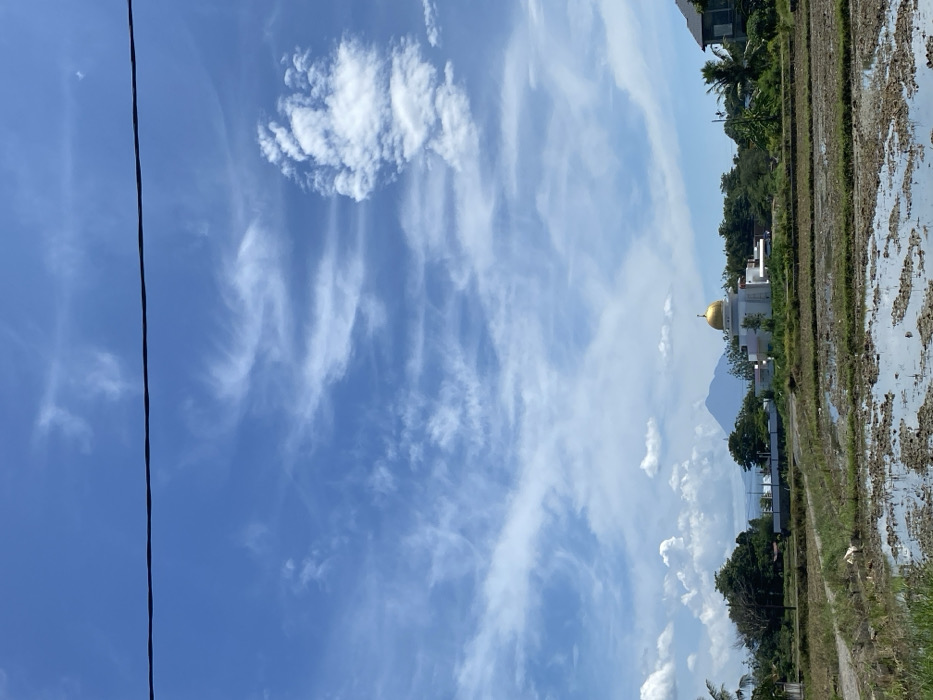 A sunny daytime scene with a vibrant blue sky streaked with white cirrus clouds. A power line runs vertically along the left edge. A golden-domed mosque nestles among green foliage, with a mountain visible in the background. Paddy fields, some filled with water, extend to the right, marking a contrast between the natural and built environments.