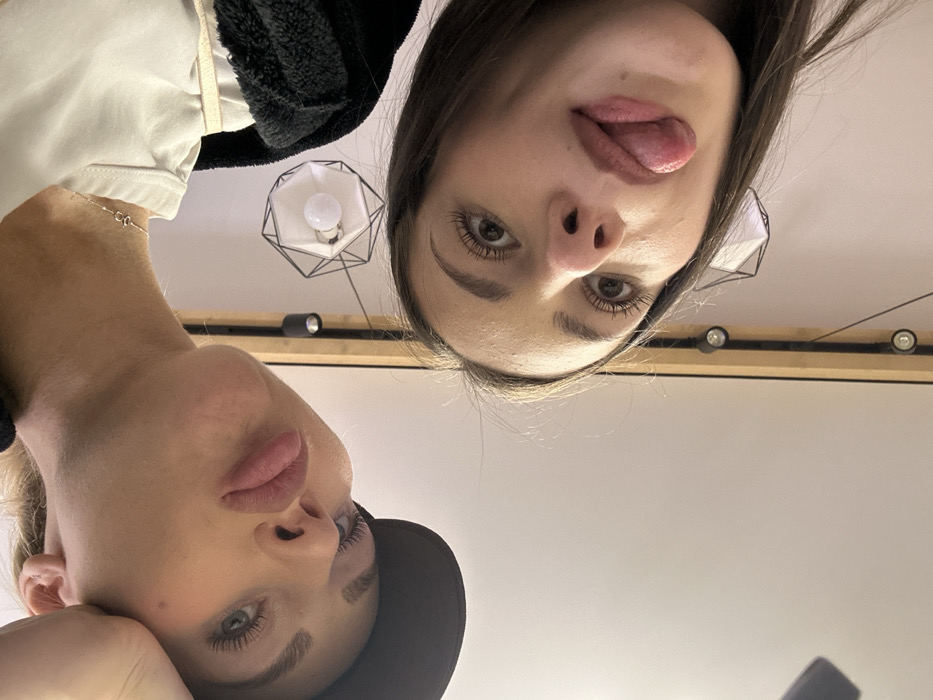 Two young women's faces are shown in a close-up, inverted view. One, with dark hair, sticks out her tongue. The other, wearing a black cap, has light hair. A white shirt and black hoodie are partially visible on the left. In the blurred background, lights hang from a wooden beam on a white ceiling.