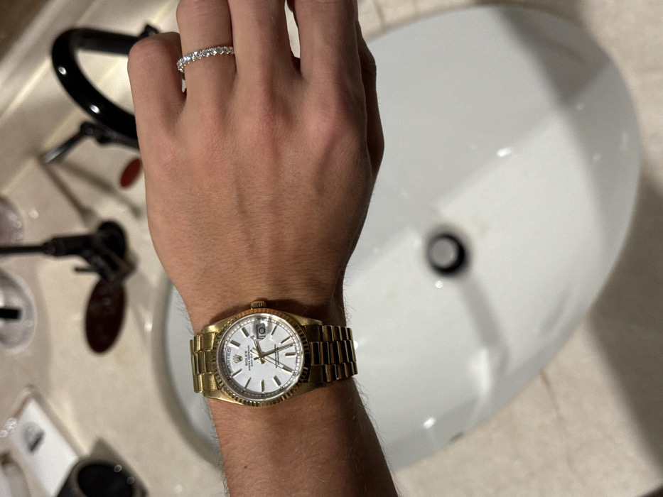 A close-up, high-angle image captures a person's left forearm and hand positioned over a white bathroom sink. The individual wears a gold-toned Rolex Oyster Perpetual Datejust wristwatch on the left wrist, featuring a white dial, fluted bezel, and a gold Jubilee bracelet. The date window on the watch displays the numeral "10". A silver-toned or white gold eternity band ring, set with numerous clear stones, adorns the fourth finger of the left hand. The white ceramic sink, containing a dark circular drain stopper, occupies the lower and central portion of the frame. In the blurred background, a dark-colored, single-handle faucet is visible behind the sink, situated on a light-toned countertop. Additional indistinct objects, including what appears to be a grooming tool, are present in the upper left background. The specific location within the city of Tongxiang, China, is not discernible from the image content.