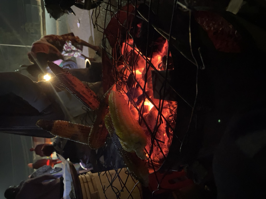 Corn on the cob cooks over an open fire, secured in a wire rack. Some ears are charred orange, while others retain their yellow color. The fire glows brightly through the grate, casting a red hue. The scene is set outdoors, with people milling around in the background. The angle of the shot is slightly tilted.