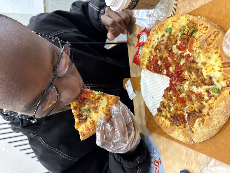 An individual with dark skin, wearing eyeglasses and a black hooded jacket, is depicted eating a slice of pizza inside a restaurant. The person holds a pizza slice to their mouth with a hand encased in a clear plastic disposable glove. On a light-colored wooden table, a partially consumed pizza rests on a wooden serving board. The pizza has a golden crust and is topped with shredded meat, red diced vegetables (likely tomatoes or bell peppers), green peas, and corn kernels over a cheese base. One slice has been removed, revealing a white paper insert on the board. To the right of the pizza, a white disposable cup with "AMERICANO" printed on it is visible, along with two condiment packets, one identified as Heinz ketchup. A blue placemat or coaster featuring Chinese characters is partially visible on the left. The background shows a clean indoor environment with vertical black and white striped wall panels, characteristic of a modern dining establishment. The presence of Chinese characters indicates the scene is located in a dining establishment within Daxing District, China; however, the specific address or venue cannot be determined from the visual information provided.