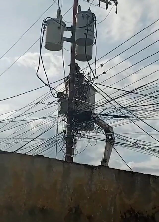 utility pole cluttered with numerous wires and electrical components. Two cylindrical transformers are mounted at the top of the pole. Beneath them, a box-like transformer is surrounded by a dense tangle of wires. A utility vehicle with an extended arm is positioned next to the pole. A person wearing a hat appears to be working on the pole, amidst the maze of wires. The pole stands adjacent to a weathered wall, and the background reveals a sky with scattered clouds.