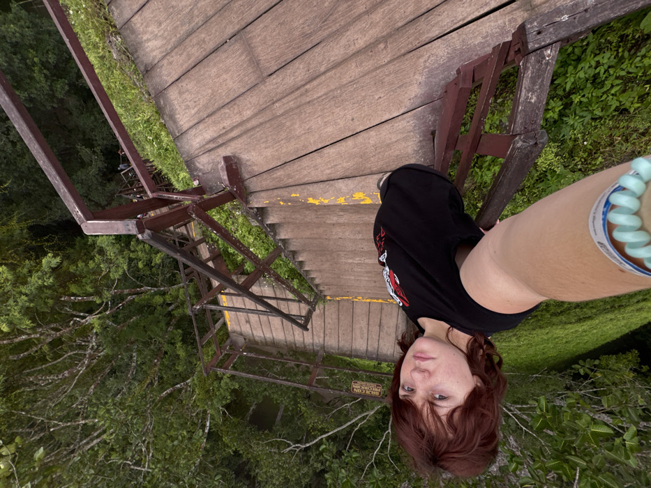 A vertically oriented photograph captures a person on a wooden staircase descending into a dense jungle environment near Flores, Guatemala. The foreground features a light-skinned individual with reddish-brown, medium-length hair, wearing a black t-shirt with a white and red graphic design, and a light blue coiled wristband on their right forearm. This individual's right arm is extended, holding the camera to capture a selfie-style view, with their gaze directed towards the lens. The immediate scene shows the upper section of a robust wooden staircase, constructed with weathered brown planks and dark brown wooden railings. Faded yellow paint marks are visible along the edges of several stair treads and landings. The staircase recedes downwards, surrounded by thick tropical foliage consisting of various green trees and undergrowth. A small, rectangular wooden sign with "SIEMPRE CON SU PECHO" inscribed in dark lettering is visible on the left side railing at a lower segment of the stairs. A faint, distant human figure can be discerned further down the descending staircase.