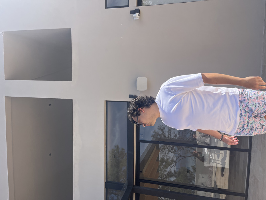 A man in a white t-shirt and floral patterned shorts is captured outdoors, leaning forward with his arms extended. He wears glasses and has dark, curly hair. A modern building with large windows and rectangular openings forms the backdrop. A security camera and a white, circular device are mounted on the wall above the window. The reflective surface of the window shows a blurred image of a person. The image is rotated to the side.