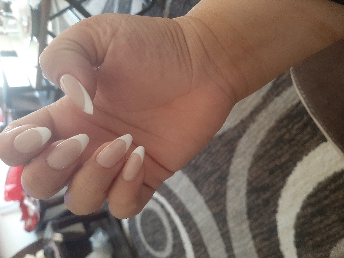 The image depicts a human left hand, displaying a medium skin tone, positioned slightly cupped with fingers extended and adorned with French manicured nails