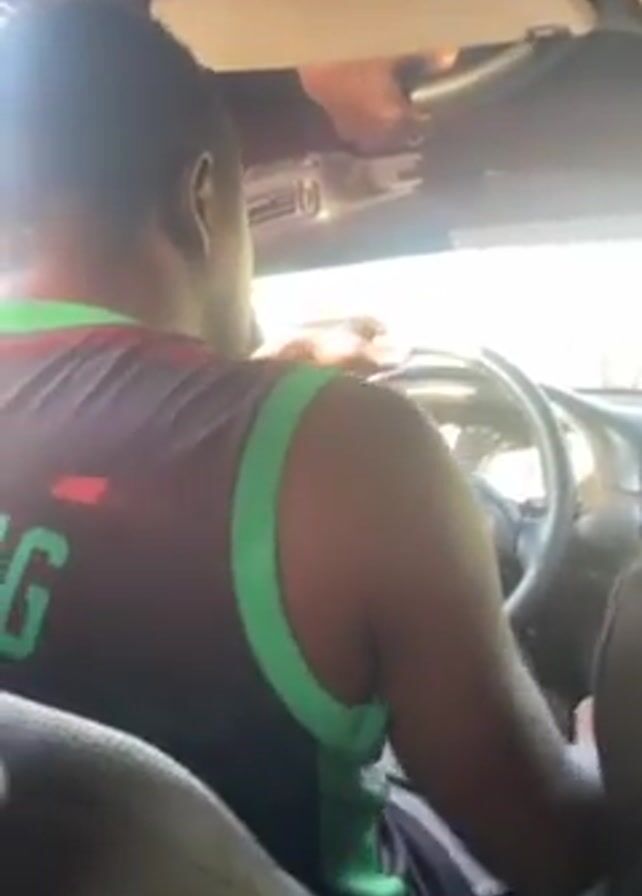 A man is driving a car. He is wearing a black sleeveless shirt with green trim and the word "KING" in green letters on the back. He is wearing an earring in his left ear. He reaches up to adjust the sun visor. The car is moving forward.