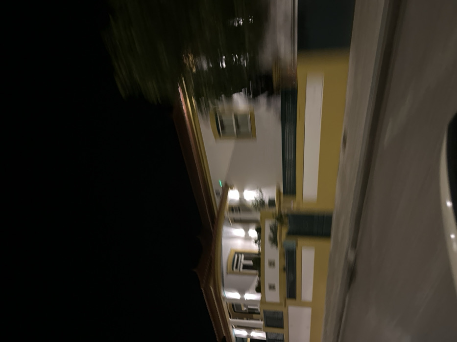 A building at night features multiple lit windows and white and green accents against a yellow facade. Dark skies surround the structure, with blurred vegetation possibly reflected in a nearby body of water. A section of a white wall, possibly a structure or vehicle, is visible on the right side of the image.