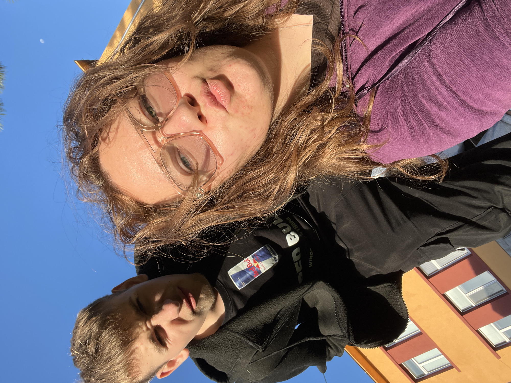 A selfie taken from a low angle looking up at two individuals, a building, and the sky. The first individual, at the top of the frame, is fair-skinned and wears pink glasses, a purple zippered jacket, and has long, wavy, light-brown hair. The second individual, near the bottom of the frame, has fair skin and light brown hair, wears a black shirt with a Red Bull logo, and a black hoodie. In the background, to the right, is a building with alternating orange and red stories, white window frames, and visible windows. Above and to the left of the building is a clear, blue sky. The photo appears to be taken outside on a sunny day. There is no verifiable evidence to suggest this photo was taken in Loznitsa, Bulgaria.