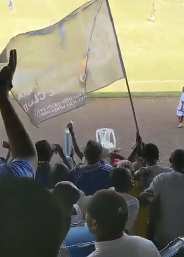 view from the stands of a soccer game. The stands are crowded with fans cheering, some with drums, cymbals, and trumpets. A flag with "Police Football" is prominently displayed. The game is being played on a green field with players in blue and black uniforms. Referees in yellow uniforms are also visible. In the background, a sign reads "Ushirika Stadium Moshi". A row of hills is visible in the distance. The fans are enthusiastically supporting their team, creating a lively atmosphere.
