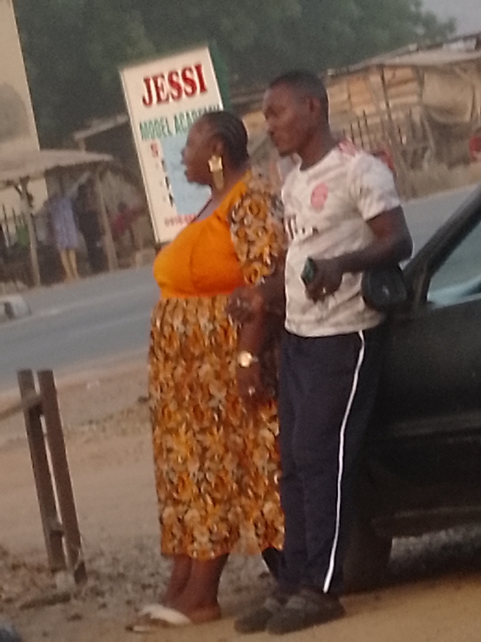 A woman in an orange and floral dress stands beside a man in a Bayern Munich jersey and dark pants with a white stripe. The woman has large earrings, and the man holds a phone. They stand near a car. A sign that reads "JESSI Model Academy" is visible in the background, along with street vendors. The scene appears to be taken outdoors.