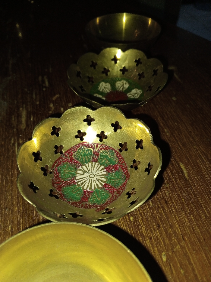 - "The scene, set in Longmiang, Laos, depicts four small brass bowls arranged on a dark wooden surface" by FM-sU0PJ2, licensed under CC BY 4.0
