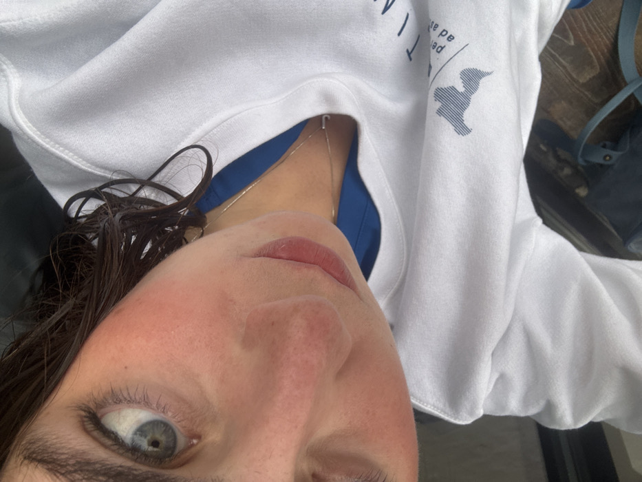 A close-up, portrait-oriented image displays the upper torso and head of an individual, likely female, captured from a slightly angled perspective. The person has dark, wavy, wet-appearing hair, prominent dark eyebrows, and a visible left eye with a light blue-grey iris. The skin on the visible cheek and nose appears flushed or rosy. Pink lipstick is applied to the lips. The individual wears a white long-sleeved sweatshirt. Beneath the sweatshirt's neckline, a portion of a blue garment is visible, possibly the collar or inner layer of a shirt. A thin, silver-colored chain necklace with a small, silver-toned "J" pendant hangs around the neck. On the lower right quadrant of the sweatshirt, a blue graphic is present. This graphic includes a stylized world map, primarily depicting the Americas, and partially legible text that appears to read "TIMIA" above the Latin phrase "per ad astra". The immediate background behind the person's head is dark and indistinct, suggesting an interior space or seating. Below the person's arm, a wooden surface is visible, possibly a table or console. On this surface, a blue object, potentially a bag or part of a seat, with a visible strap, is partially obscured. The scene is situated in the city of Houston, United States. However, specific environmental details within the provided image are not discernible to pinpoint a precise location within the city.