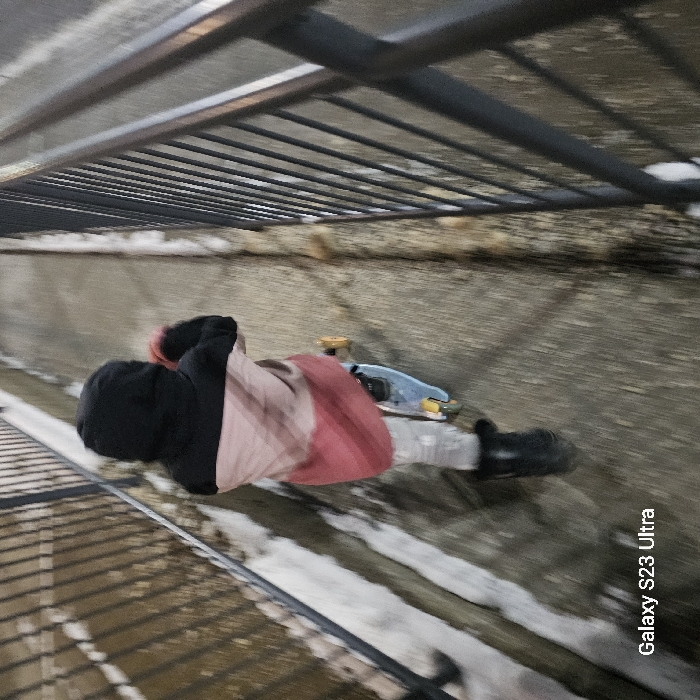 The blurred image captures a person with black boots and light grey pants is using an electric scooter. They're wearing a black hoodie over a red jacket. The photo is taken from an elevated perspective, looking down through metal bars. The surface they are riding on is concrete with patches of snow along the edges. The "Galaxy S23 Ultra" watermark is visible in the bottom right corner of the image.