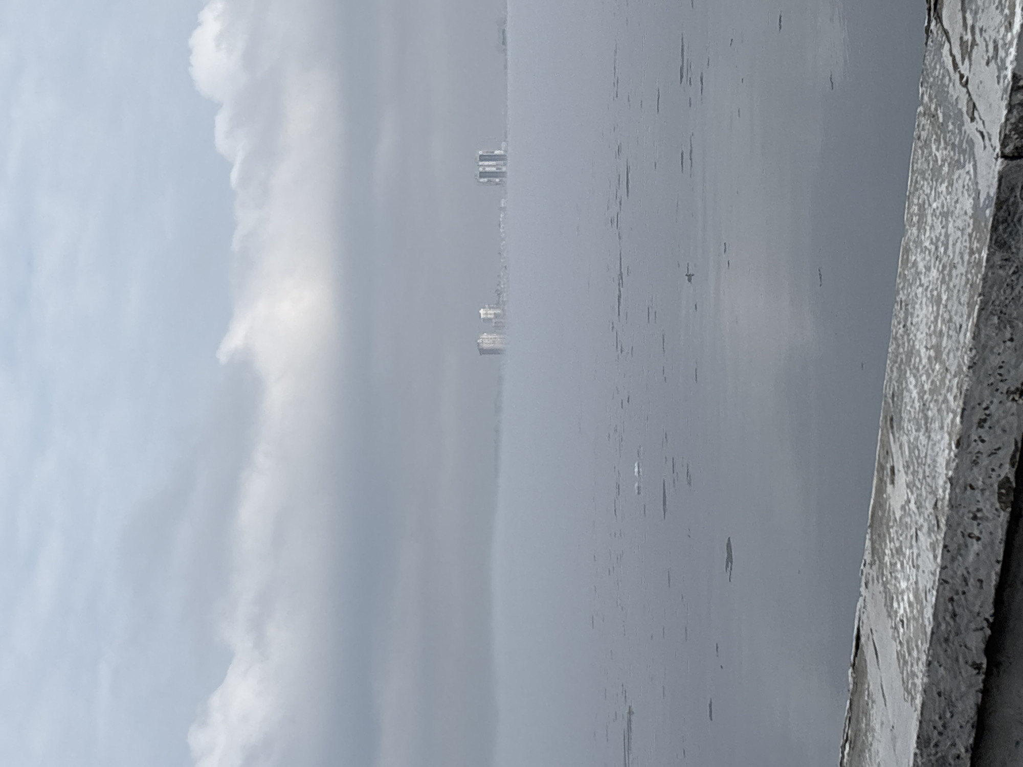 cityscape across a body of water, possibly a bay or sea. The weather appears overcast, with heavy clouds dominating the sky. In the distance, indistinct buildings are visible on the horizon, possibly an urban center. In the foreground, a weathered, concrete structure acts as a barrier or edge. The water is calm and gray, with minimal visible movement. The perspective is a high angle, suggesting the photograph was taken from an elevated position. There are no people visible in the frame.