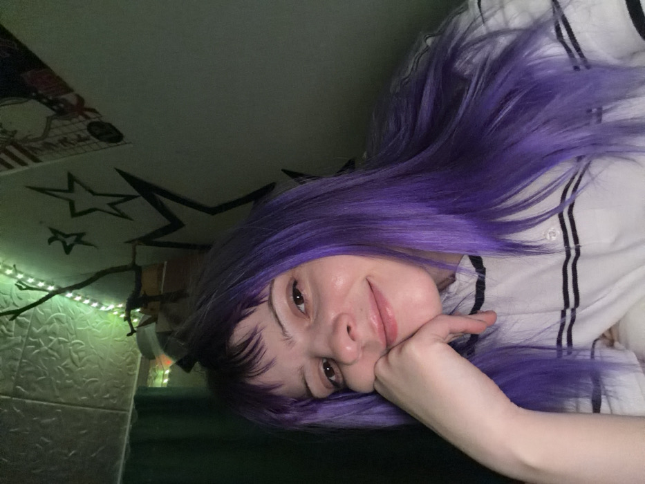 A woman with bright purple hair, featuring short bangs, smiles softly with her cheek resting on her hand. She wears a white collared shirt with dark stripes. The backdrop includes a green-toned wall with a textured pattern, along with a ceiling adorned with a star design and a poster. Faint green fairy lights are also visible, lending a soft glow to the scene. The image is rotated, giving a slightly tilted perspective.
