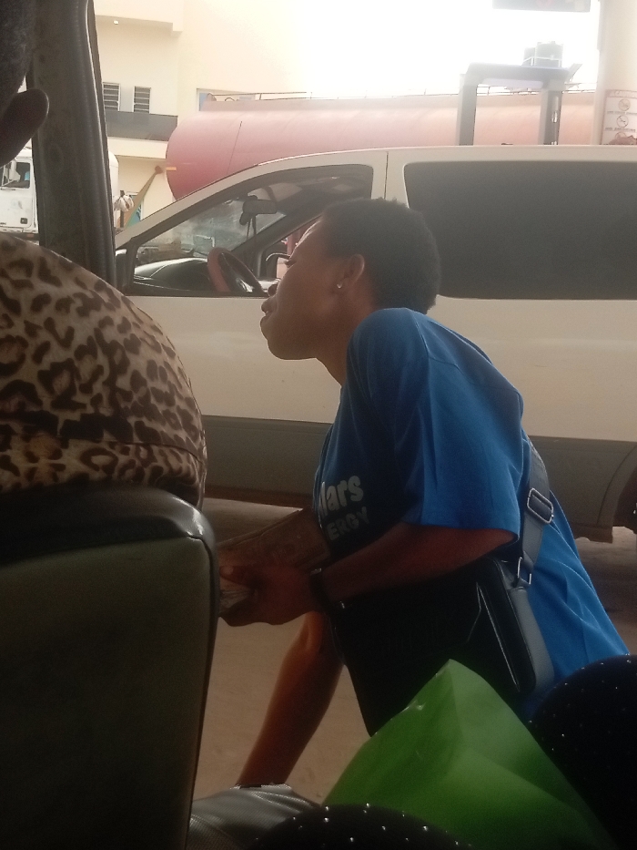 The image depicts a roadside scene, likely a fuel station or commercial area, in Awkuzu, Nigeria