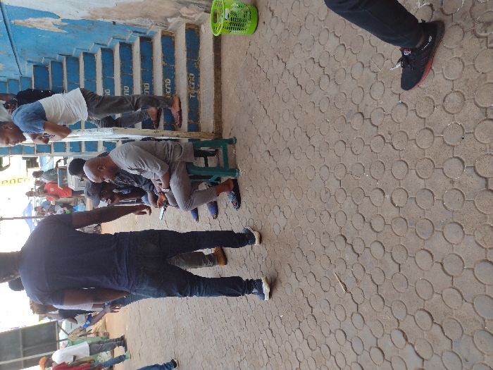 A group of people are standing outside. One man is sitting on a green stool while another man leans on a nearby rail. Behind them are blue stairs with "TECNO" printed on the sides. The ground is paved with circular patterns. A green basket sits near the top of the stairs. One man is wearing black shoes with red accents. The scene appears to be an outdoor gathering in a public space.
