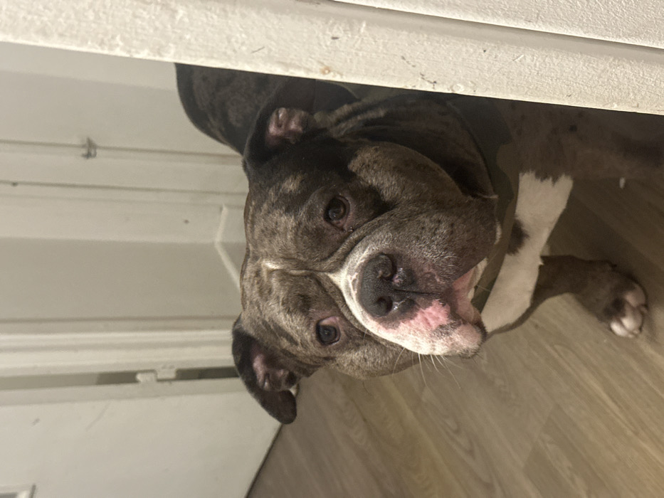- "A brindle and white dog, consistent with a bulldog-type breed such as an American Bully, is positioned centrally, facing the viewer directly" by FM-lS6eB2, licensed under CC BY 4.0
