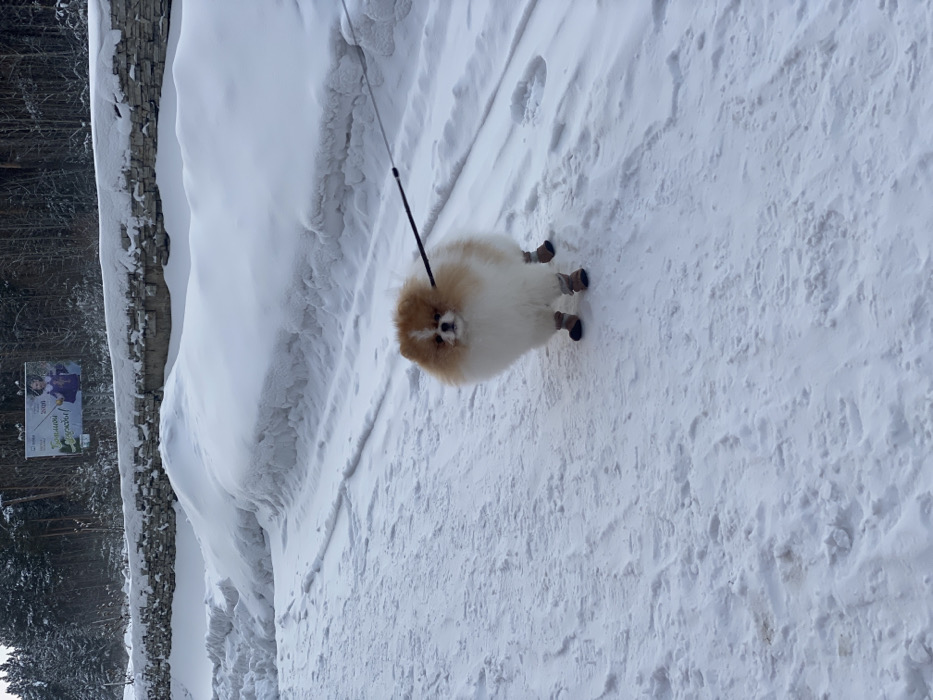 A small, fluffy Pomeranian dog wearing brown booties is seen walking on a snow-covered path. The dog is on a leash. Thick snow lines the edge of the path, and a stone wall is visible to the left. In the background, a forest borders the scene, along with a billboard. The dog's fur is a mix of white and light brown. The scene is illuminated by daylight.