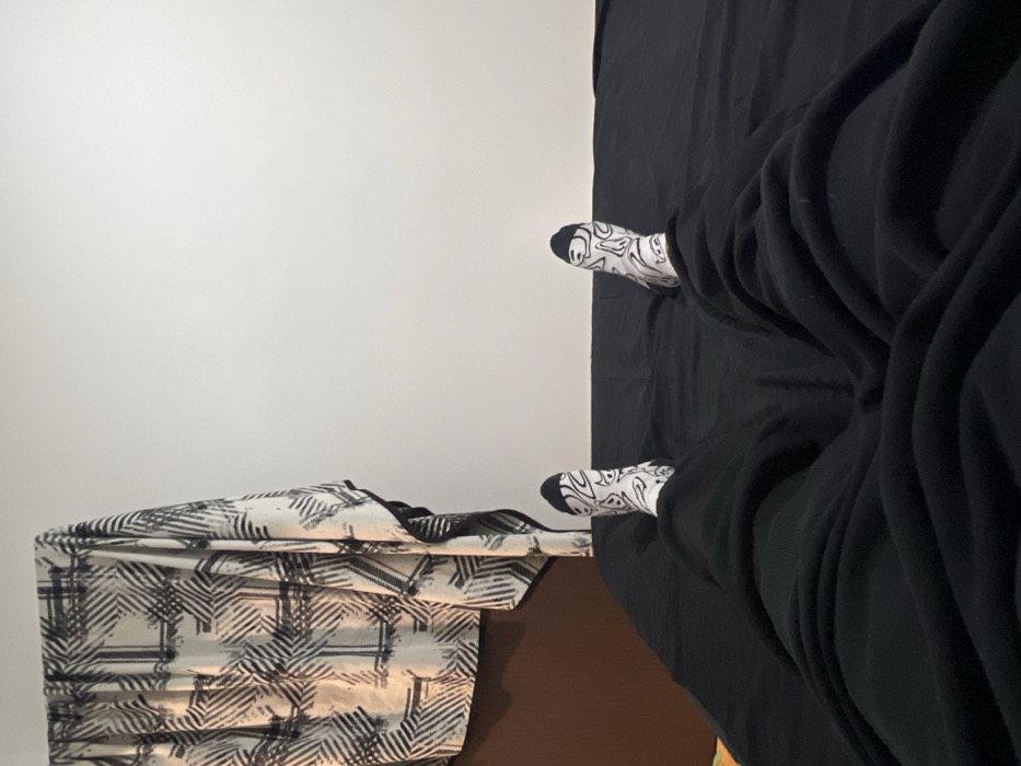 A person lies on a black bed wearing black sweatpants and white socks with black designs