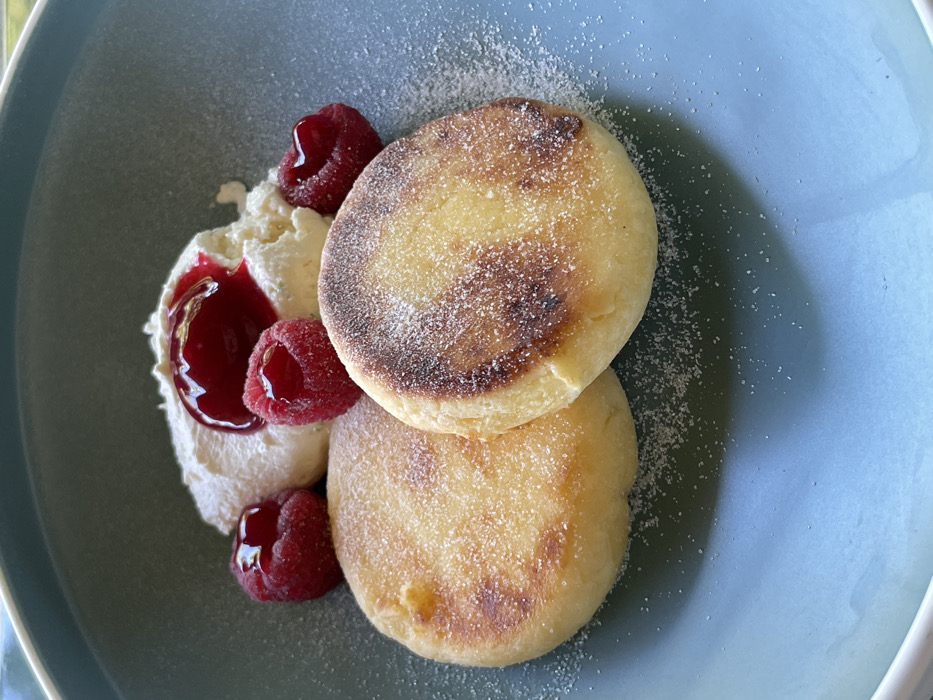 Two golden, round syrniki are stacked on a blue plate, dusted with powdered sugar. Next to them sits a dollop of whipped cream topped with bright red raspberry jam. Three fresh raspberries, glistening with jam, complete the arrangement. The overall presentation suggests a light, sweet dessert or breakfast dish. The plate appears to be part of a larger set, with a subtle rim detail visible.