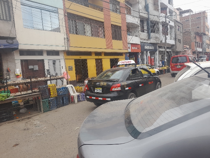 The image depicts an active street scene in Trujillo, Peru, observed from the perspective of a vehicle situated in the foreground