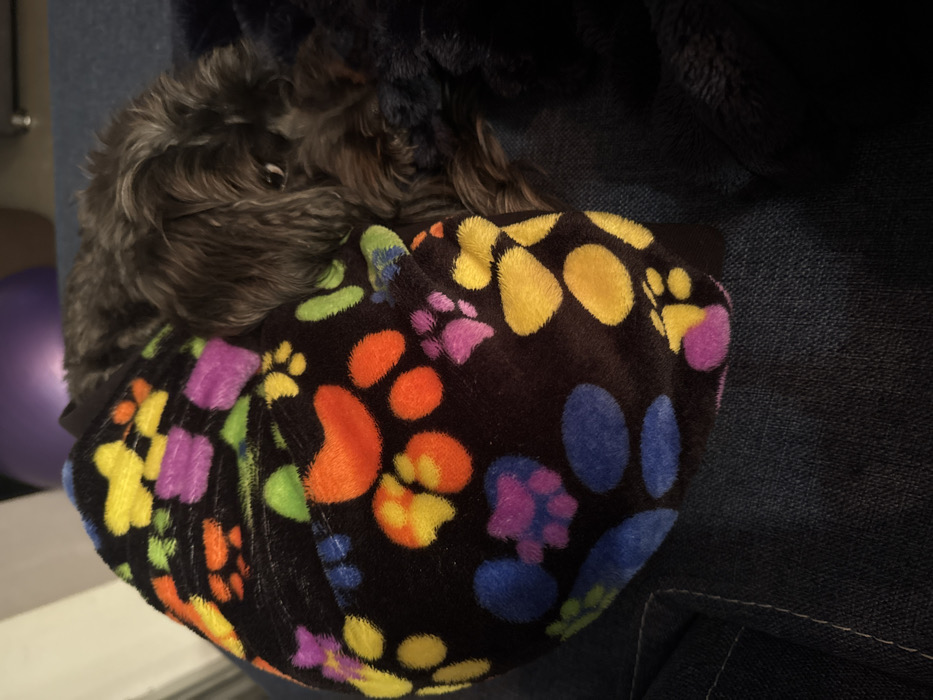 A curled-up, dark-gray dog rests on a dark denim surface. The dog is partially covered by a soft, black blanket patterned with colorful paw prints in yellow, orange, purple, green, and blue. The dog's face is visible within its fur, tucked slightly towards the blanket. Part of a dark-purple exercise ball is seen in the background.