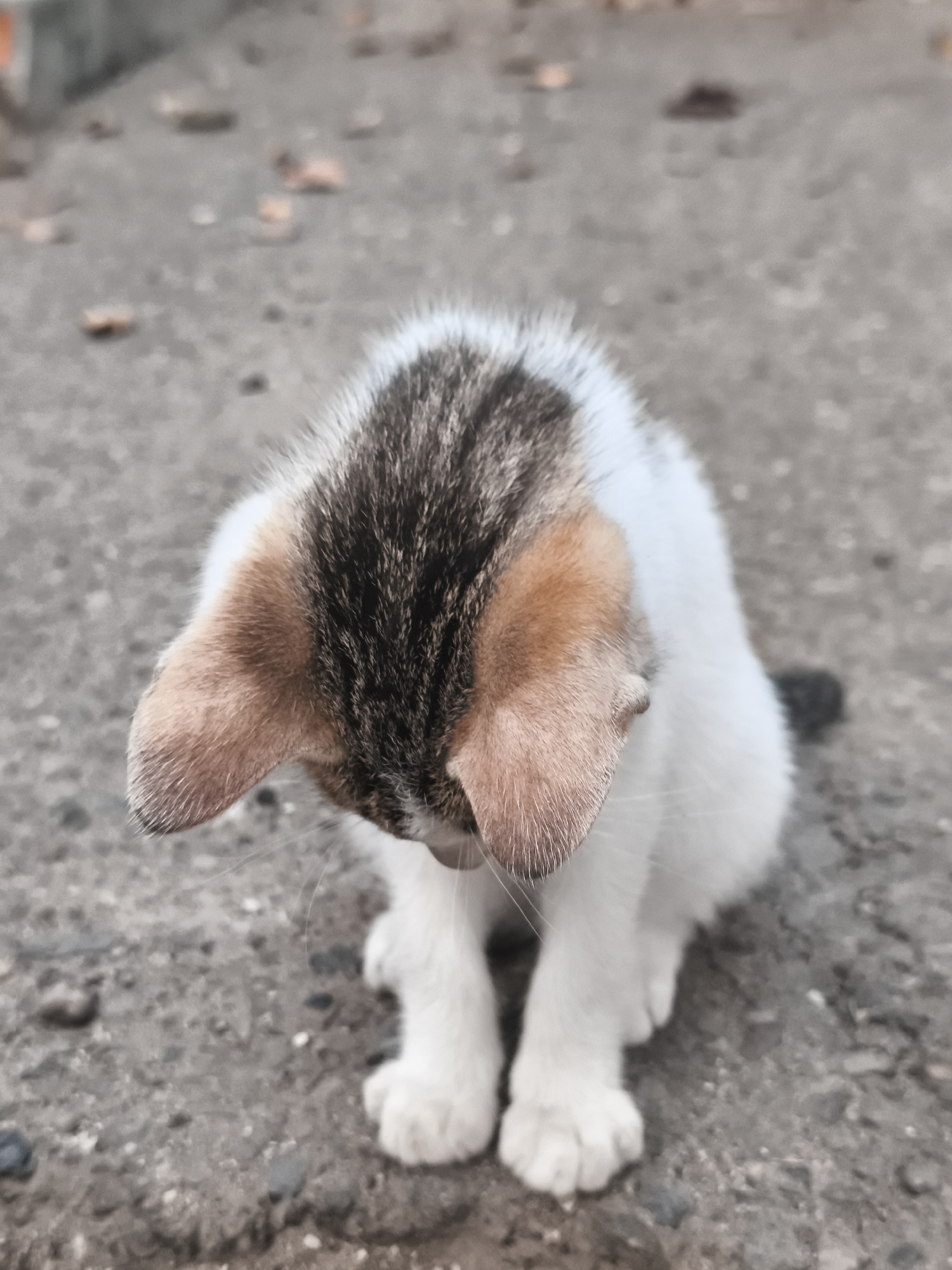 A small kitten is positioned centrally on a textured, grey concrete or asphalt surface in Lhokseumawe, Indonesia. The kitten exhibits a calico coat pattern, featuring white fur on its chest, belly, and legs, contrasted with dark brown/black tabby stripes and ginger/tan patches primarily on its head, back, and ears. Its head is bowed downward, directing its gaze towards the ground directly in front of its paws. The kitten's ears are erect, displaying the lighter tan fur within. The ground surface is uneven and appears to have scattered small debris, possibly dried leaves or dirt particles. The background is out of focus.