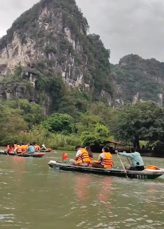 The scene shows several small boats filled with people on a river, likely as part of a tour