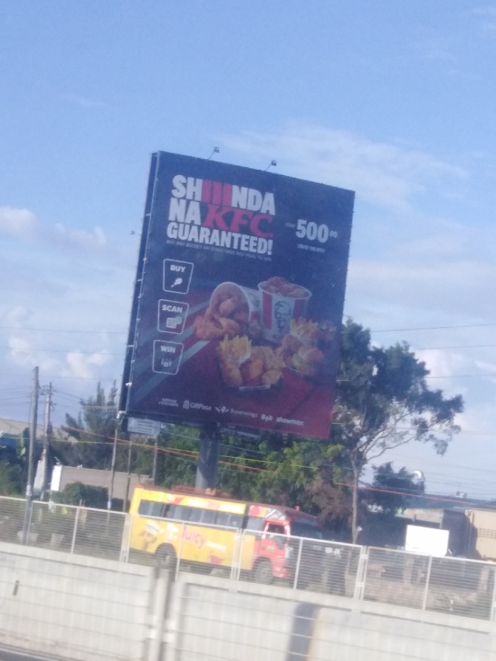 A large, rectangular billboard advertises KFC. The bold text "SHINDA NA KFC GUARANTEED!" is prominently displayed, alongside the offer of "500/s". The ad features images of KFC chicken and fries, with instructions to "BUY," "SCAN," and "WIN." The bottom of the billboard lists "MGAO PETROL STATION" with "CAFE Pesa," "Ksweeneyk," "Bplt," and "Showmax." A yellow and red bus is visible below the billboard.
