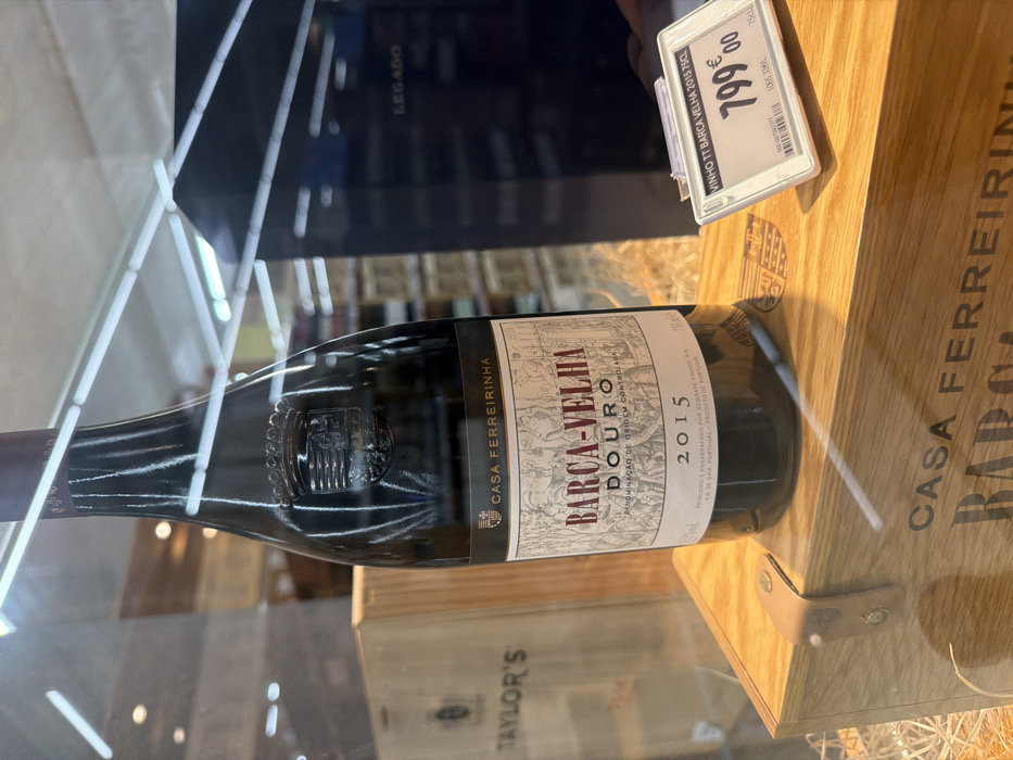 A dark glass bottle of "Barca Velha Douro 2015" red wine is presented within a retail display case in Lamego, Portugal