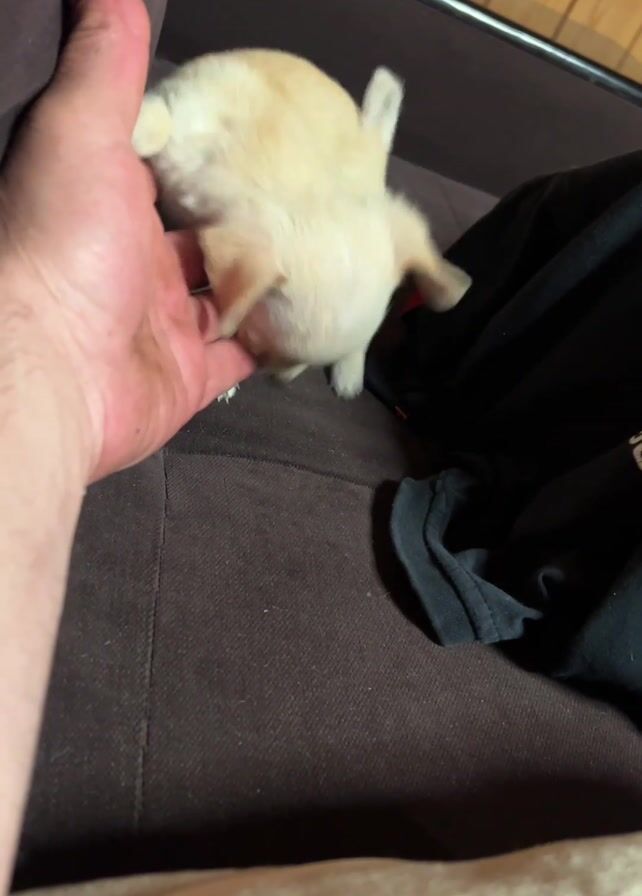 A small, cream-colored Chihuahua puppy is on a brown sofa, near some black clothing. A fair-skinned hand is petting the puppy. The puppy nips and licks the hand. The background shows a wall with vertical wood paneling.