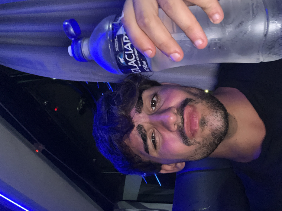 A man holds a water bottle. The bottle is partially empty, and the label "GLACIAR" is visible. He has dark hair, a beard, and is wearing a black shirt. The background has a blue hue, and parts of a vehicle interior are visible. The angle of the photo suggests it might have been taken in a confined space, like a car. A reflection on the interior surface is noticed.