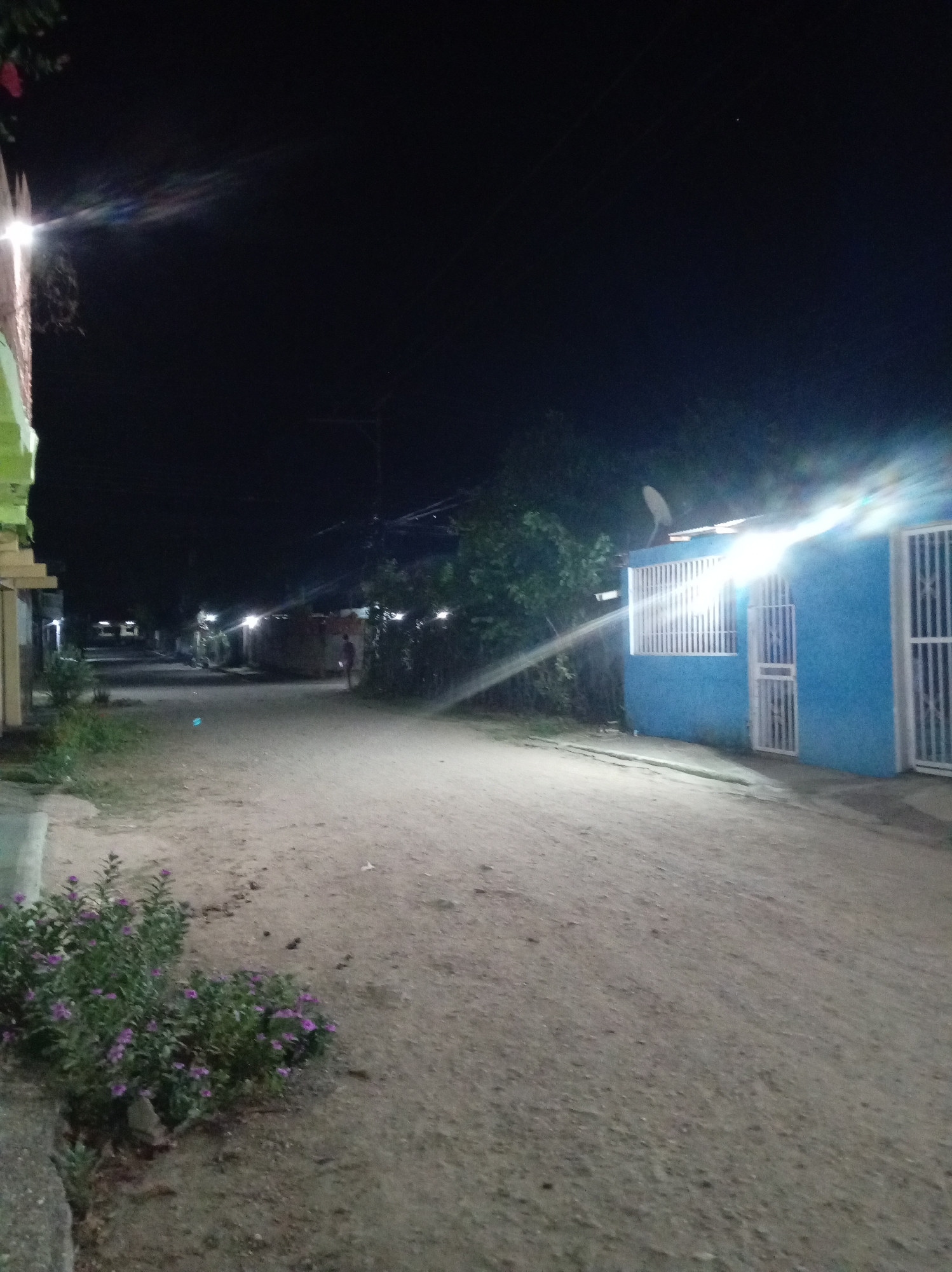 This image depicts a nighttime scene on an unpaved dirt road in Parroquia Ocumare, Venezuela. In the foreground on the left, a concrete curb is visible with green foliage and purple flowers. A strong artificial light source emanates from a structure partially visible on the far left. On the right side of the road, a blue single-story building features a white barred window and a white barred entrance gate, with a satellite dish mounted on its roof. Bright artificial light sources from this building and the one on the left generate prominent lens flares across the upper and central portions of the frame. Further down the unpaved road, a single, blurred individual is observed walking away from the camera on the right side of the thoroughfare. The background shows the road extending into darkness, punctuated by several distant artificial lights, beneath a dark night sky containing one faint visible point of light.