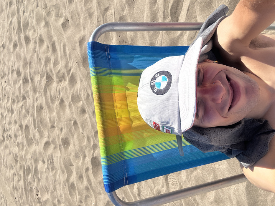 A man lies on a blue, yellow, and green striped beach chair with a light gray BMW baseball cap. The chair sits on a sandy beach. The man's face is visible, with eyes closed and a slight smile. He wears a dark gray shirt draped over his shoulder. The beach is light brown, with patterns of light and shadow from the sun.