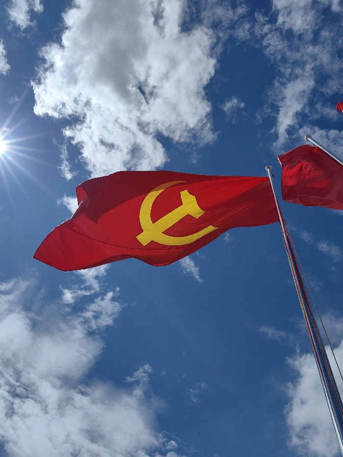 A vibrant red flag emblazoned with a yellow hammer and sickle emblem flutters against a backdrop of a bright blue sky scattered with puffy white clouds. The sun's rays beam from the upper left corner, casting a luminous glow. Another flag, also red, is partially visible on the right. The flags are mounted on silver poles, reaching skyward, conveying a sense of political display against the serene sky.