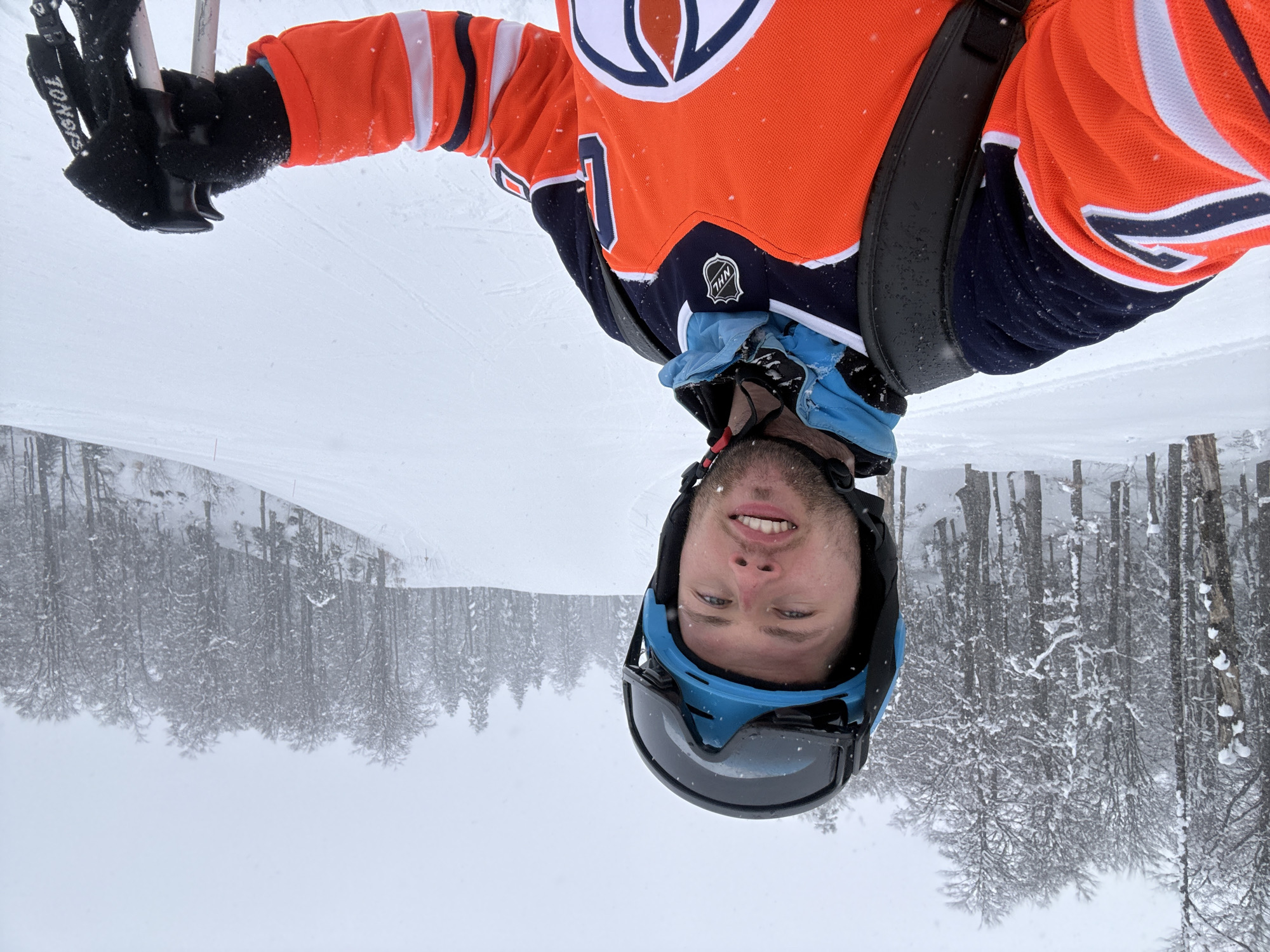 A young adult male is depicted in a self-portrait on a snow-covered ski slope, presumably in the vicinity of Mušovića Rijeka, Montenegro. He is wearing a light blue ski helmet with dark ski goggles pushed up, and an orange, navy blue, and white NHL Edmonton Oilers hockey jersey. A black backpack strap crosses his right shoulder. His left hand, covered by a black glove, holds two ski poles, one with a "ROSSIGNOL" brand strap visible. The man has a light beard and is smiling directly at the camera. The background features a wide, snow-covered ski run extending uphill, bordered by a dense forest of snow-laden deciduous and evergreen trees. Light to moderate snowfall is actively occurring, visible throughout the frame against an overcast sky.