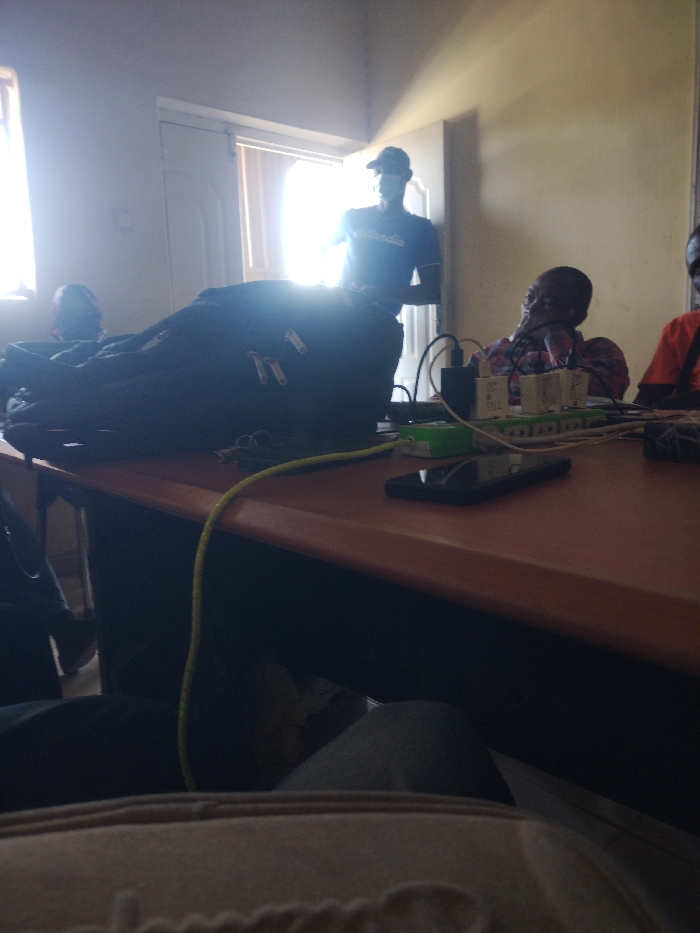 The image depicts an indoor scene in Fagge C, Nigeria, with a strong light source originating from a doorway and window on the left, causing backlighting. In the immediate foreground, the lower portion of a person's legs, clad in dark trousers, is visible, partially obscured by a beige object. A brown-topped table dominates the midground, featuring a large black backpack. To the right of the backpack, a coiled yellow-green cable extends across the table, past a black smartphone placed face down. Further right, a white multi-socket power strip with several connected black power adapters and cables is present. In the background, a man wearing a dark cap and a blue t-shirt with "Skholandia" written on it stands silhouetted in a brightly lit doorway at the center. To his right, a seated man wears a red and black plaid shirt, resting his chin on his right hand, looking towards the left. A third individual, partially visible on the far right, wears an orange shirt. A window on the far left also emits strong light. The walls of the room are light beige.