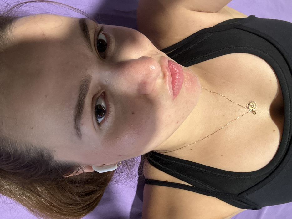 A close-up, inverted portrait of a female subject is presented, capturing her from the upper chest to the crown of her head. The subject is positioned supine, with her face oriented towards the bottom of the frame. Her dark eyes are open and directed towards the camera. Her lips are full and light pink. She exhibits a fair to medium complexion. Her upper torso is covered by a black athletic top or sports bra with visible straps. A thin, gold-colored chain necklace with a small circular pendant rests in the sternal notch area. A white wireless earbud is visible in her right ear (viewer's left). Her brown hair is partially visible to the lower right of the frame. The background consists of a uniform, matte light purple surface, likely a mat or fabric. The lighting generates a distinct diagonal shadow across her forehead and nose. No specific geographic location, including any area within Paris, France, is identifiable from the visible scene elements.