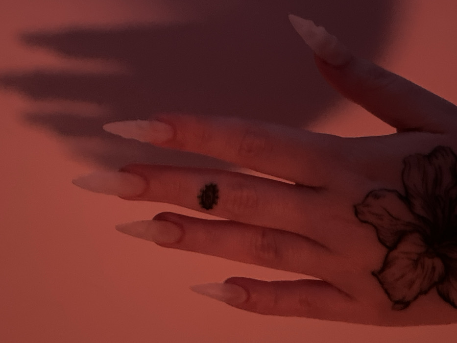 A close-up photograph captures a human left hand, palm-up, set against a plain background illuminated entirely by red light. The hand displays long, pointed, light-colored artificial nails on all visible digits. A small, dark, oval-shaped tattoo is visible on the lateral side of the ring finger. A larger, dark-outlined floral tattoo covers a portion of the palm. Multiple dark, elongated, irregular shadows are cast onto the upper right section of the background. The specific location within the City of Zagreb, Croatia, is not discernible from the visual evidence.