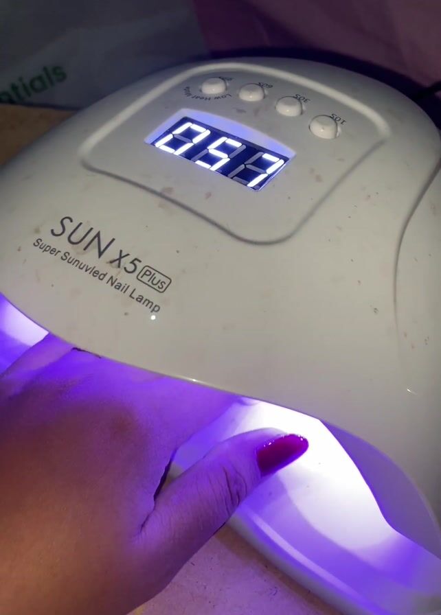 A person with a hand with red gel nails is seen using a nail lamp
