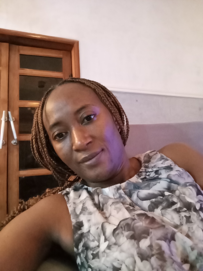 A woman with braided hair smiles at the camera. She is wearing a sleeveless shirt with a floral pattern in shades of grey. Behind her is a wooden door with glass panels and silver handles. The background wall is white with a grey accent. The lighting is soft, creating a relaxed atmosphere.