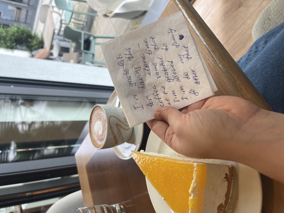 The image depicts an indoor scene within a cafe, specifically located in Bad Kreuznach, Germany. The foreground features a brown wooden table upon which a slice of cheesecake, a coffee beverage, and a glass of water are arranged. The cheesecake, positioned on a white plate to the left, has a bright orange, possibly mango or passionfruit, jelly layer atop a white creamy layer and a biscuit base. To the right of the cake, a white ceramic cup containing a latte with a heart-shaped latte art design sits on a matching saucer. A clear glass tumbler filled with water is visible behind the cake. A person's right hand, wearing blue denim pants, holds a white paper napkin in the lower right portion of the frame. The napkin bears handwritten text in blue ink which reads: "I'm grateful for having this coffee alone time at the same time that I'm grateful to I'm allowed to so after that 💙". The background reveals a large window looking out onto an outdoor patio area. Tables and chairs, some in light blue or green, are visible on the patio, suggesting outdoor seating. Blurred figures of other patrons or passersby are faintly discernible outdoors. Green foliage from plants or trees can be seen beyond the patio, indicating an urban or semi-urban setting. The interior features simple, modern furnishings with natural light entering through the large window.