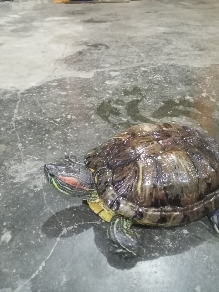- "A single red-eared slider turtle is observed stationary on a textured, grey concrete surface in Ketowan, Indonesia" by FM-cHJi83, licensed under CC BY 4.0
