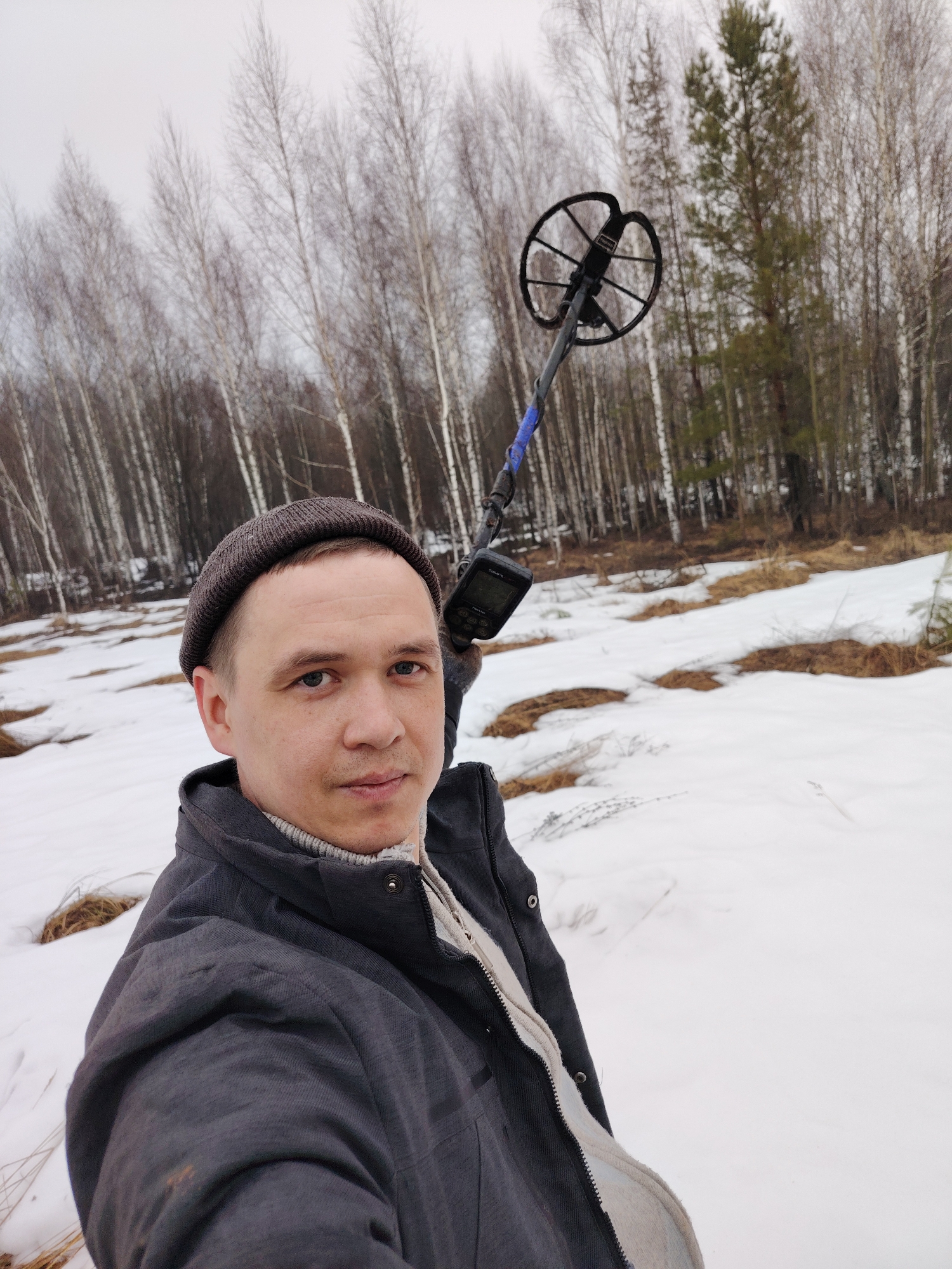 The image is a selfie taken in a snowy, partially wooded area. The person in the foreground, presumably the one taking the photo, is a man with short hair wearing a beanie, jacket, and sweater. He is holding a metal detector in the air. The ground is covered in snow with patches of dry grass visible. In the background, there is a dense forest with birch trees, some of which are bare and some evergreen trees. The sky is overcast. The location is in Марковский, Russia.
