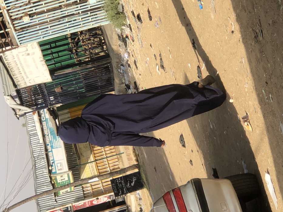 A person wearing a dark blue robe and hood walks along a sunny street. The street is lined with shops and buildings, and a car is parked nearby. There is some litter on the side of the road.