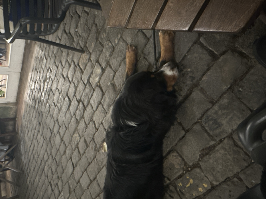 A black, brown, and white Bernese Mountain Dog is sprawled out on a cobblestone path. The dog's front paws are extended and tucked under a wooden table. Part of a metal chair is visible in the upper left, and part of another chair on the lower right. The cobblestones create a textured surface surrounding the dog.