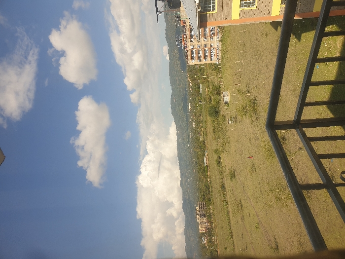 The image presents an elevated panoramic view of a semi-urban landscape in Mumbuni North ward, Kenya, under a bright blue sky with scattered cumulus clouds. In the immediate foreground, a dark metal balcony railing, composed of horizontal and vertical bars, extends across the lower portion of the frame. To the right, a section of a building facade, painted yellow with brown trim and featuring white-framed windows, is visible. The midground is dominated by an expansive, uncultivated field covered in dry, light-green grass and interspersed with small, sparse bushes. A faint dirt path traverses horizontally across the left side of this field. A lone individual, distinguishable by a red garment, is situated centrally in the field, moving from left to right. Towards the middle-right of the field, a small, light-colored rectangular structure, possibly a shed or enclosure, is visible. Scattered wooden posts, suggesting fencing, are present throughout the field. In the further midground, multiple multi-story buildings are observable. On the far left, a light-colored building, potentially under construction or recently completed, stands. On the far right, a completed multi-story residential building with light-colored walls and numerous windows features several black water tanks on its roof. The background is defined by a range of green, vegetated hills extending across the entire horizon.