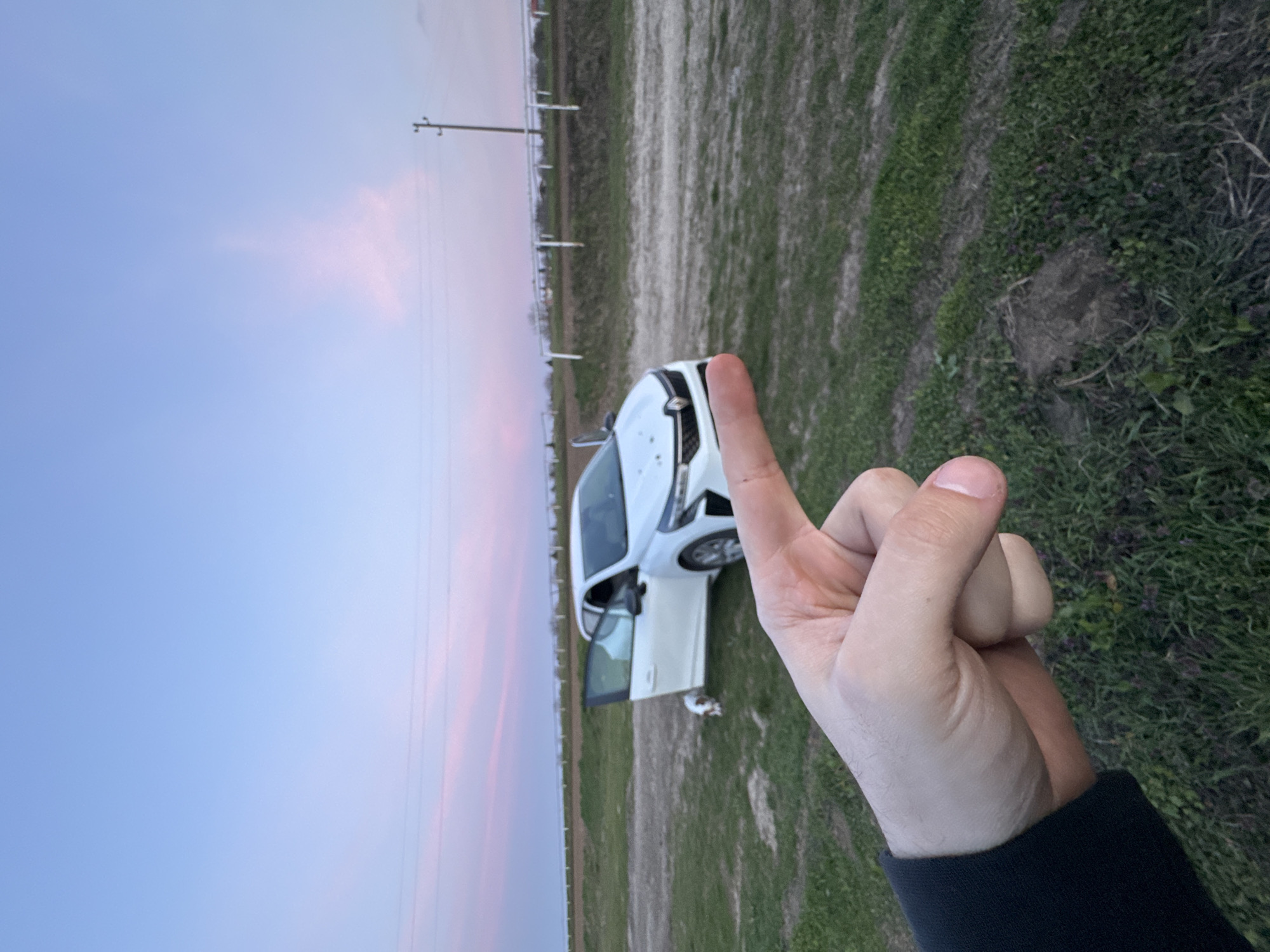 The scene is an outdoor, rural or semi-rural setting in Sandrovo, Bulgaria, observed at twilight. In the immediate foreground, a light-skinned human hand, wearing a black long-sleeved garment, is visible on the left, with the index finger extended and pointing towards the right. The ground beneath the hand is covered in green grass with patches of exposed earth. In the midground, a white five-door compact car, consistent with a modern Renault Clio, is parked on a grassy and muddy surface. Both the front driver's side and front passenger's side doors are open. A small, white and brown dog is partially visible on the ground near the open driver's side door. Several small, dark, circular objects or marks are present on the car's hood. To the right of the car, a dirt track runs horizontally across the frame. Beyond the track, a low white fence with vertical posts is present. The background consists of a slightly elevated land mass or field behind the fence. A single wooden utility pole with wires is visible on the right side, extending upwards. The sky displays a gradient of colors, transitioning from light blue at the top to soft pink and purple hues near the horizon, with sparse, faint pink clouds.